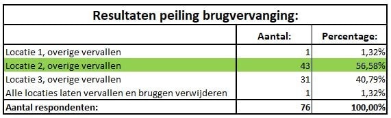 De gemeente wilt graag van u, als buurtbewoner, weten op welke locatie u graag een brug terug ziet komen of juist de voorkeur heeft ze alle drie te laten vervallen. Daarom vragen we u om hierover uw stem uit te brengen. Op basis van de resultaten van de peiling, zullen de bruggen al dan niet worden vervangen. Hieronder kunt u een overzichtskaart met de locaties van de bruggen downloaden.